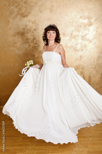 adult, attractive, beautiful, beauty, bouquet, bridal, bride, caucasian, dress, elegance, elegant, fashion, female, flower, girl, glamour, gold, gown, hair, happy, lady, luxury, marriage, married, to marry, model, 1, only, person, portrait, pretty, rose, seductive, silk, smile, smiling, studio, style, wedding, white, woman, young