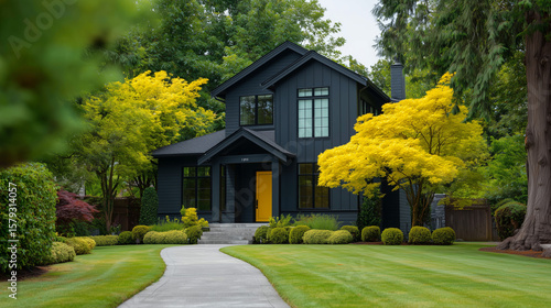 Beautiful dark two story House with a manicured Lawn, yellow Front Door and a mature Yellow Tree on a sunny day, with a curved walkway leading up to the entrance Generative AI