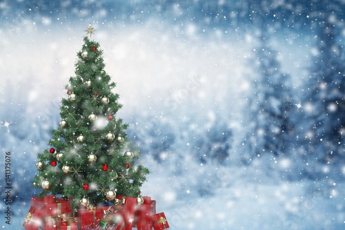 christmas, tree, snow, background, winter, scene, christmas, outside, light, blue, gold, snowy, present, gift, white, red, ice, star, festive, nature, box, landscape, art, beautiful, bright, celebration, cold, colourful, day