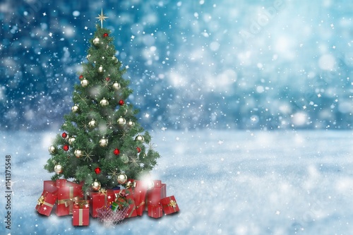 christmas, tree, snow, background, winter, scene, christmas, outside, light, blue, gold, snowy, present, gift, white, red, ice, star, festive, nature, box, landscape, art, beautiful, bright, celebration, cold, colourful, day