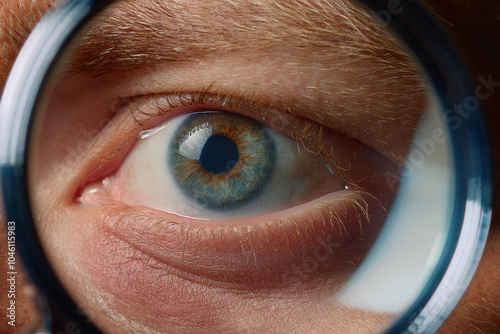 Beautiful detailed macro photography of the eye of a man, woman and children through a magnifying glass as a close or careful focus on the health and optics of vision