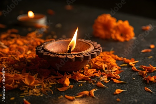 Beautiful Diwali Greeting using Diya or clay oil lamp lit and arranged over Rangoli made by multi coloured rice grains, selective focus