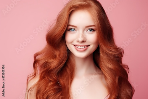 Beautiful elegant european red-haired smiling young woman with perfect skin and long red hair, on a pink background, close-up