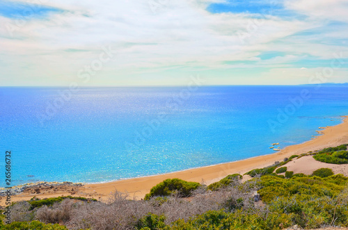 Beautiful empty beach in Turkish Northern Cyprus taken against sun. The remote place is Golden Beach in Karpas Peninsula. Summer vacation destination