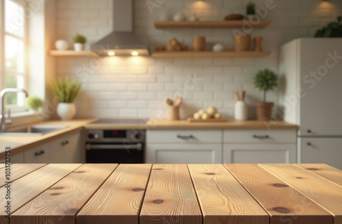 beautiful, empty, brown, wooden, countertop, blurred background, modern, glare, daylight, kitchen, furniture, interior, white