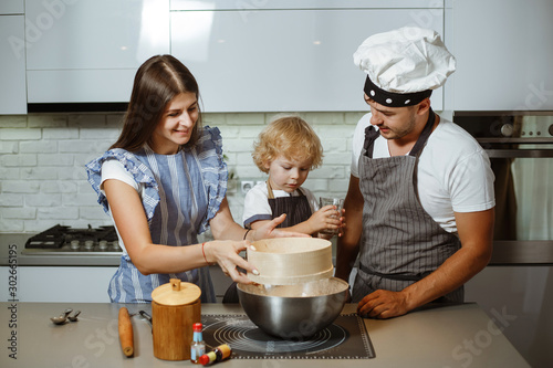 Beautiful family in the kitchen together preparing a pizza.
