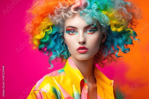 Beautiful fashion model portrait. European young woman portrait. Bright colors, stylish makeup. Generative AI