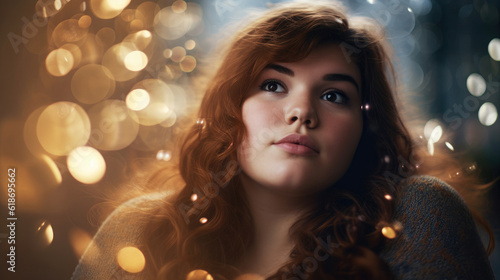 Beautiful fat young woman, golden bokeh background