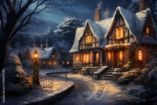 Beautiful festive Christmas scene including snow, and Christmas lights.