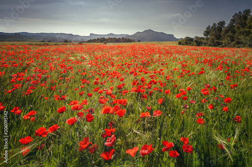 Beautiful field of red poppies in the sunrise light, in the Valderrobres medieval village, Matarrana district, Teruel province, Spain