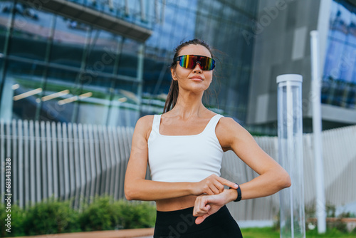 beautiful fit Asian woman in sunglasses, checks pulse on fitness bracelet is standing in park, looking into distance against the background of a large glass building during break of running training.