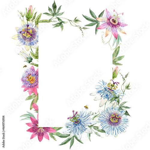 Beautiful floral frame with hand drawn watercolor passionflowers. Stock 2022 illustration.
