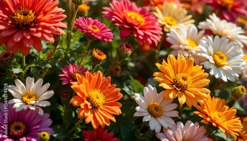 Beautiful flower garden of saturated blooms set against a bright blue sky backdrop