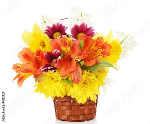 Beautiful flowers in wicker basket, isolated on white