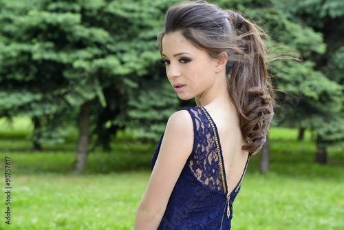 people, one person, missy, female, teenage, posh, fashion, formal, dark blue, brunette, ponytail, make-up, pale, caucasian, nature, outside, park, path, road, tree, greengrass, spring, day, afternoon, clothing, attractive, feminine, stylish, sensual, standing, posing, front view, delicate, lace, silk, beautiful, purse, portrait