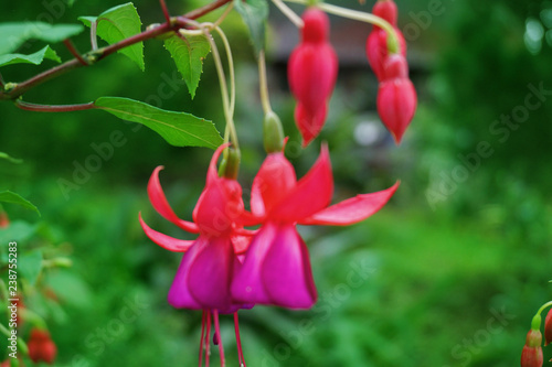 Beautiful fuchsia six red petals and purple center with blurred background floral wallpaper botanic garden summer time