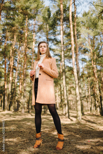 beautiful girl in a coat with glasses outdoors. portrait of a young woman outdoors