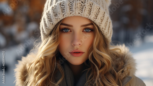 beautiful girl in a mountain forest. girl with a backpack. girl in a mountain jacket and hat.