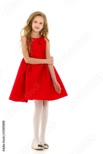 girl, children, cute, happy, white, female, person, beautiful, young, childhood, length, full, body, red, dress, blond, arm, look, camera, standing, slim, pretty, smile, holding, hand, background, little, portrait, people, caucasian, cheerful, happiness, bright, adorable, 1, beauty, hair, positive, isolated, studio, children, posing, attractive, indoor, modern, long, coiffure, clothing, positivity, schoolgirl