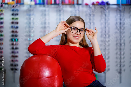 beautiful girl in an ophthalmology center picks up glasses for vision correction