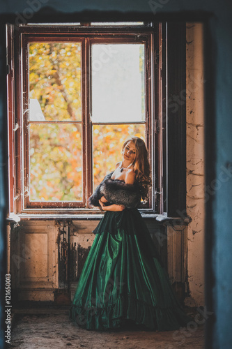 Beautiful girl in green vintage dress with coat walking near ancient house and door. Vintage farytale concept. Woman with long hair and make up