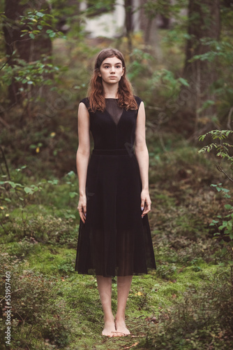beautiful girl in the forest A young woman in a black dress balancing barefoot in the forest on covered with moss. Forest therapy concept.