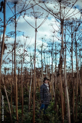 Beautiful girl in the tall grass in autumn.