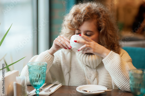 Beautiful girl is sitting in a cafe and drinking from white cup of coffee or tea. Inside