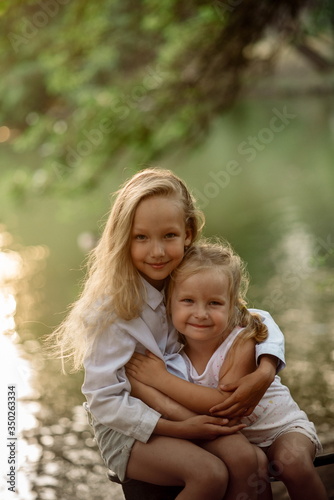 Beautiful girl of 7 years old with long blonde hair with a little sister walks and cuddles at sunset in a park near a pond on a summer evening