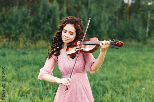 Beautiful girl with curly black hair in pink dress plays the violin in field at summer forest,