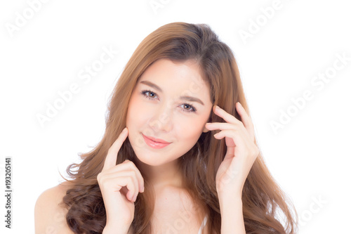 Beautiful girl with makeup, woman and skin care cosmetic concept / attractive beauty asian girl on face with hand touch cheek and smile isolated on white background.
