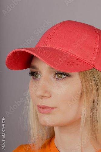 Beautiful girl with natural make-up in a headdress on a gray background.