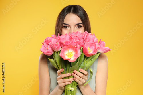 Beautiful girl with spring tulips on yellow background. International Women's Day