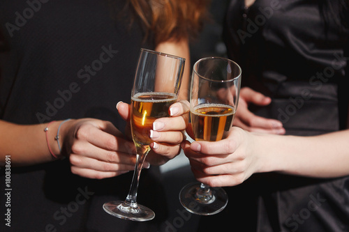 Beautiful girls in evening dresses with glasses of champagne to celebrate the New year