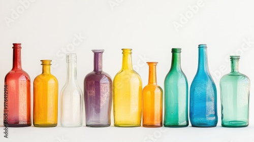 Beautiful glass bottles in vivid colors, arranged in a chic set against a simple white background for a modern and elegant look