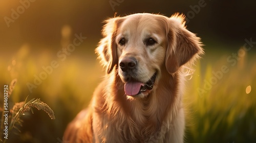 Beautiful golden retriever adult dog in a woodland outdoor sunlit, countryside setting.
