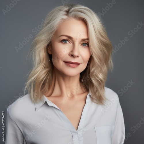 Beautiful gorgeous 50s mid aged mature woman looking at camera isolated on gray. AI Generated