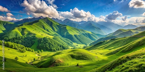 Beautiful green mountain landscape in sunny weather with grassy hills and blue sky in Georgia. Travel concept, nature