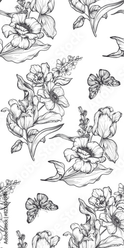 Beautiful hand drawn vector seamless pattern with black and white garden flowers, butterflies. Endless background with spring garden plants