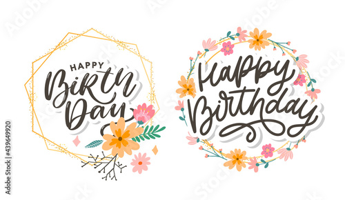Beautiful happy birthday greeting card with flowers and bird. Vector party invitation with floral elements.