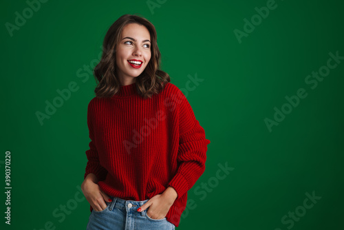woman, people, girl, posing, looking, smiling, happy, joyful, cheerful, lip, red, young, caucasian, brunette, isolated, green, background, copy space