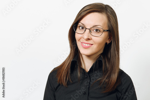 Beautiful happy caucasian young smiling brown-hair business woman in black classic shirt and glasses isolated on white background close up. Manager, worker, student. Copy space for advertisement.
