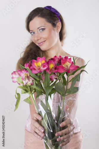 adult, attractive, background, beautiful, bouquet, brunette, caucasian, cheerful, cute, dress, female, florist, flower, fresh, gift, girl, give, giving, happy, holding, orchid, people, person, portrait, pretty, red, smile, spring, studio, summer, white, woman, young, happiness, celebration, present, emotional, mother, day