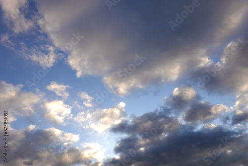 Beautiful heaven landscape with dense stormy white and gray clouds on different levels against the sun and some blue sky