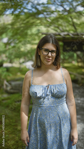 Beautiful hispanic woman in glasses, joyful portrait of her smiling, laughing and posing confident in japan's traditional kyoto park, emotion painted on her carefree face surrounded by nature