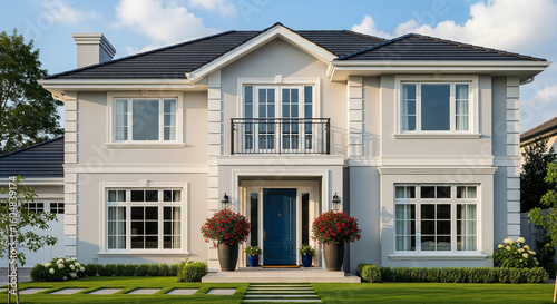 charming, two-story, home, exterior, facades, welcoming, porch, lush, green, landscaping, colourful, hydrangea, hedge, lawn, window, wispy clouds, setting sun, peaceful, suburban, traditional, classic, beautiful, house, garden, front yard, residential, property, architecture, design, elegant, inviting, serene, tranquil, picturesque, idylli, manicured, vibrant, blooming, natural