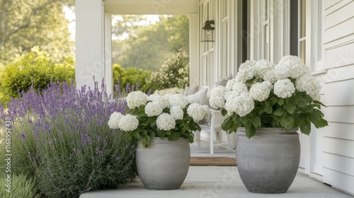 hydrangea, lavandula, porch, garden, flower, serene, sunny, decoration, landscaping, home, bloom, pot, greenery, calmness, nature, beauty, peaceful, plant, summer, patio, floral, atmosphere, relaxation, white, design, front, yard, sunlight, vibrant, colours, living, arrangement, potted, natural, decor, backyard, flowering, gardening, hortensia, field, container, styling, rustic, charme