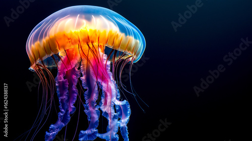 Beautiful illuminated jellyfish swim deep on black background. Medusa neon jellyfish fantasy in space underwater purple and orange color Sea life concept