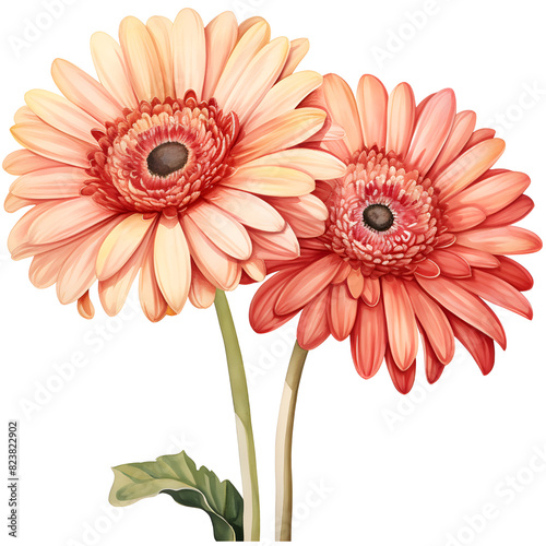 Beautiful illustration of two vibrant gerbera daisies in bloom, showcasing their colorful petals and detailed textures against a white background.