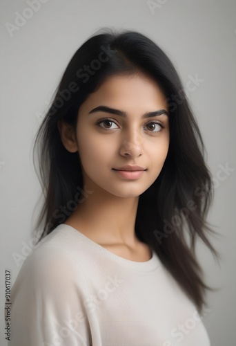 Beautiful Indian Female Model Wearing White TShirt on Plain Background